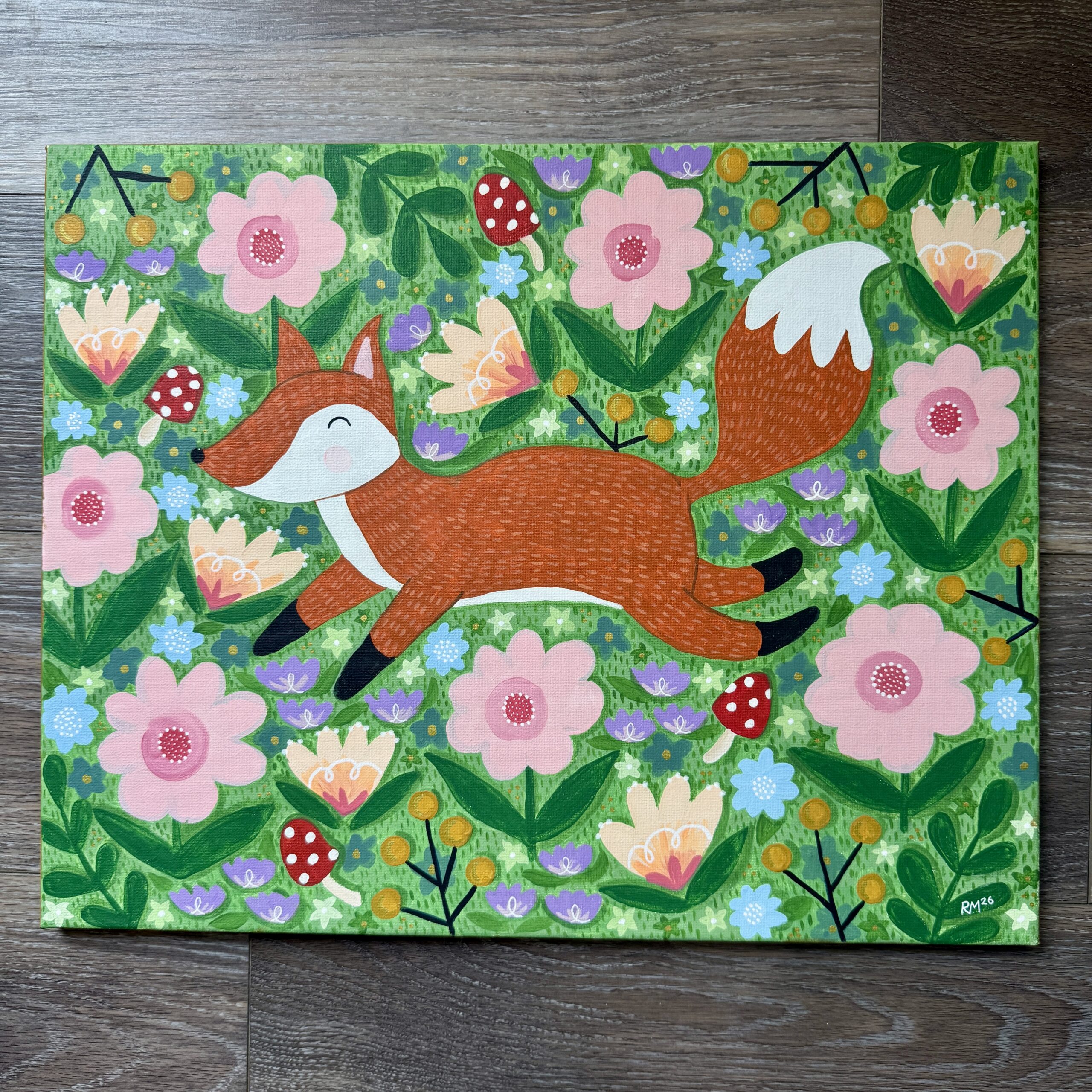 Or view it on Etsy: https://ruthmillercreative.etsy.com/listing/4488576194/fox-jumping-in-meadow-original-acrylic